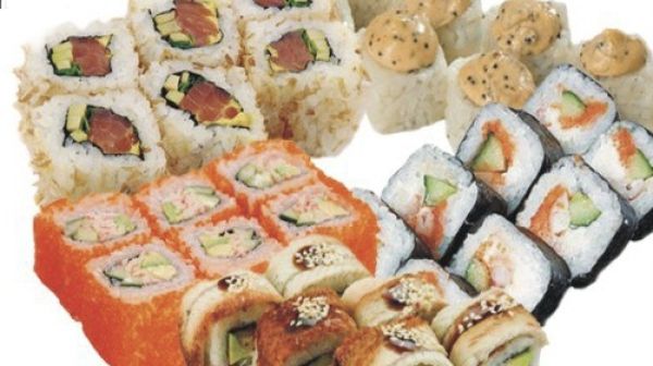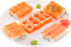 Украшен Манговым соусом, икрой Масаго и черным кунжутом